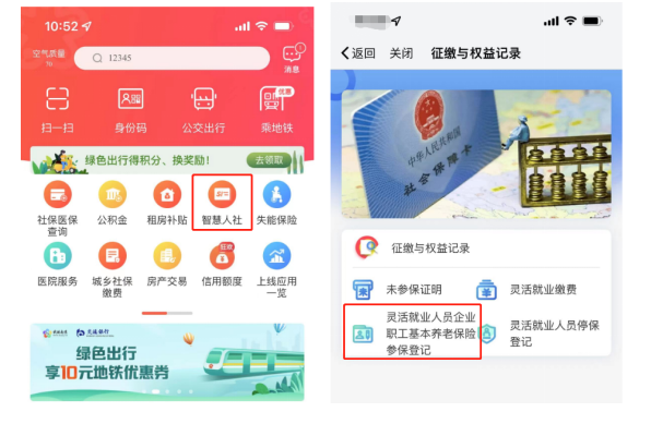 (3)“我的南京”APP办理路径:智慧人社—社会保险—征缴与权益记录—灵活就业人员企业职工基本养老保险参保登记。
