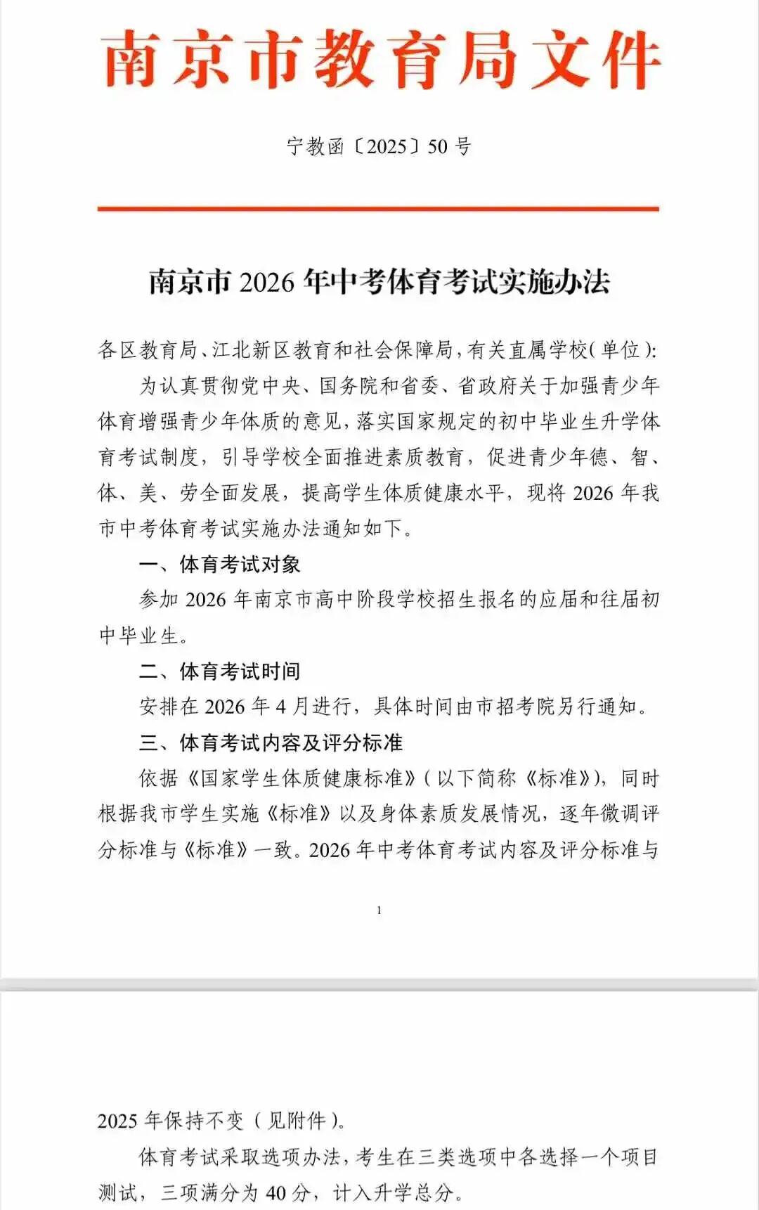 2026年南京中考体育考试内容及评分标准发布,与2025年保持不变,考试时间为2026年4月