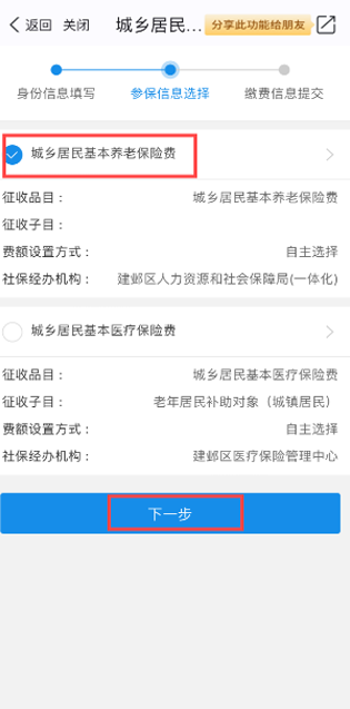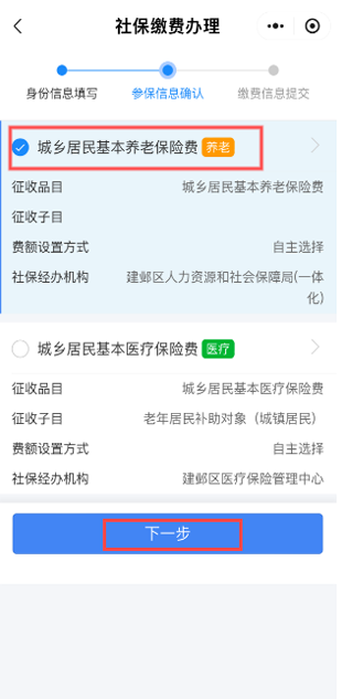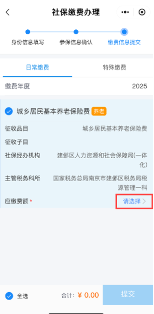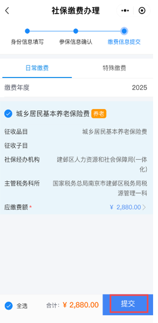 进入“我的南京”APP首页,点击“社区—城乡居民和灵活就业人员社保缴费”,选择“社保缴费办理”,核对“身份信息”和“参保信息”后,进入“缴费信息提交”界面,进行选档、缴费。