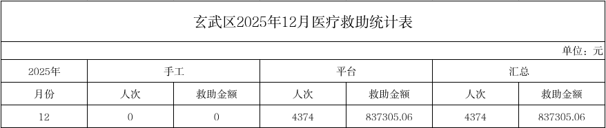 | 信息名称: | 南京市玄武区2025年12月医疗救助统计表 | ||