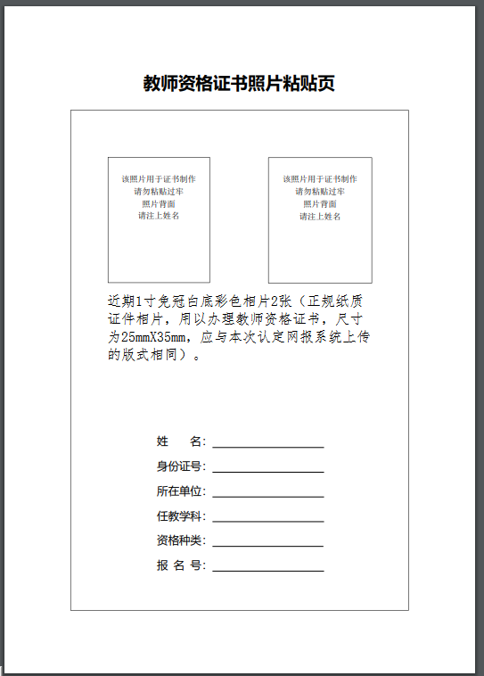 (七)用于办理教师资格证书的申请人近期免冠证件照2张,规格要求为白底彩色,尺寸为一寸(25mmX35mm),用相片纸冲印,与本次认定时网报系统上传的为同一底版,相片背面写明姓名和身份证号,贴在相片粘贴页上。