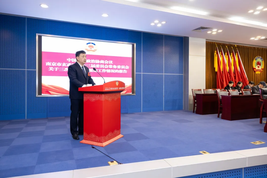闵一峰强调,2025年是“十四五”规划冲刺收官之年,也是“十五五”发展谋篇布局之年。习近平总书记对江苏发展寄予厚望,党的十八大以来,总书记多次亲临江苏考察、参加全国人民代表大会江苏代表团审议,作出一系列重要讲话,为江苏高质量发展、现代化建设,指明了前进方向、提供了根本遵循。全区要深入贯彻习近平总书记对江苏工作重要讲话精神,锐意进取、真抓实干,筑牢忠诚之心、夯实产业之基、把握民生之本、彰显实干之为,以实际行动深化产业强区建设,推进中心城区动能再造、转型发展。 闵一峰要求,全区政协组织和广大政协委员要继承和发扬人民政协光荣传统,坚定践行全过程人民民主,坚定不移讲政治、铸忠诚,集思广益建真言、谋良策,持之以恒增共识、聚合力,全力以赴强作风、优队伍,努力为推进中国式现代化玄武新实践凝聚更多智慧、汇聚更大合力。 区政协主席许恺代表区政协第十三届委员会常务委员会作工作报告。报告回顾了2024年区政协工作取得的成绩。报告认为,区政协常委会坚持以习近平新时代中国特色社会主义思想为指导,在中共玄武区委的坚强领导下,紧紧围绕全区发展大局,锚定政协年度目标,积极践行全过程人民民主,充分释放政协协商新效能,为奋力谱写“强富美高”新玄武现代化建设新篇章做出了积极贡献。一年来,区政协牢记政治责任,强化党的全面领导,把握政协工作正确政治方向更加坚定;践行协商民主,深入推进双向发力,服务玄武高质量发展更有作为;突出人民至上,下沉履职服务为民,助力民生福祉改善更显担当;深化改革创新,牢牢把握时代要求,特色履职品牌建设更为出彩;注重强基固本,提高履职能力水平,政协自身建设更富成效。