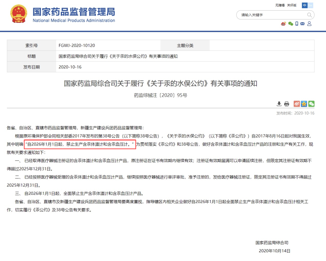 根据国家药监局综合司关于履行《关于汞的水俣公约》有关事项的通知,自2026年1月1日起,禁止生产含汞体温计和含汞血压计。