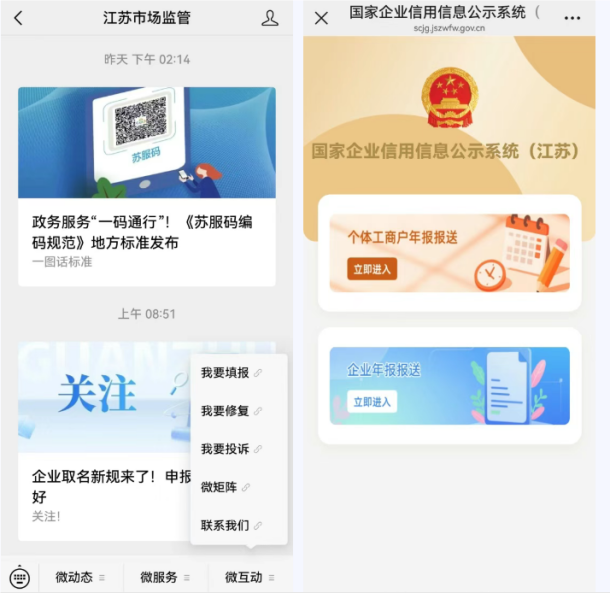 2.移动端:关注“江苏市场监管”公众号,点击“微互动”中的“我要填报”。