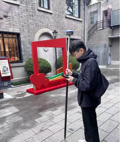 根据项目进程,近现代重要史迹及代表性建筑是近期的工作重点,普查队员们来到梅园新村历史文化街区,对周恩来图书馆、梅园新村1-4、9-12号民国住宅等建筑进行数据采集。周恩来图书馆是沉浸梅园记忆、赓续红色血脉的重要场所,由民国初期的民居式小楼改建组合而成。普查队员仔细查阅两线图纸,做好细节部分的研判,反复确认建筑方位与采集点位,力争RTK打点“一杆到位”,切实提升普查效率和数据精准度。