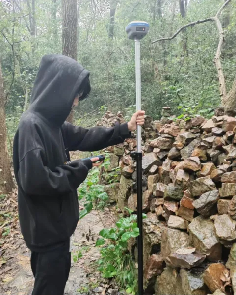 中午时分,普查工作告一段落,经过简单休整,普查队出发前往中山陵区域,下午将要对万福寺遗址进行初步摸排,梳理汇总试点经验,从而开启下一个文物类别——古遗址的整体采集工作。万福寺遗址地处紫金山马腰东,为市级文物保护单位,石头材质,雕刻清晰,属于塔类中的单层塔。普查队员根据向导指引行走在树林与石道之间,拍摄文物周边面貌,查看塔身纹路,做好影像记录,并对文物本体范围进行核实。