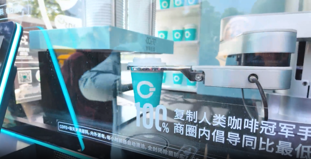 经典的拿铁、卡布奇诺和焦糖玛奇朵,还有一些特色饮品,这一切在这个小空间内都能实现。扫码付款下单后便能透过玻璃窗看到咖啡机器人开始制作,取杯、落冰、泵水、磨豆、萃取、打奶泡到出杯,整个过程不到1分钟便能快速喝到一杯现磨咖啡。
